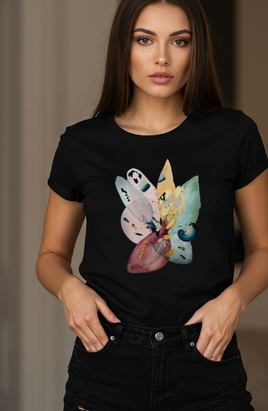 Acest tricou imbina arta cu moda intr-un mod natural si elegant. Grafica watercolor ofera un efect vizual fluid, plin de miscare si emotie, potrivit pentru femeile care apreciaza detaliile creative si stilul personal. Este o alegere ideala pentru tinute care transmit sensibilitate, optimism si inspiratie.